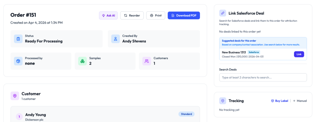 Linking a CRM deal to a sample order creates a direct connection between your sample activity and your sales pipeline. This is the foundation of revenue attribution in SampleHQ.
